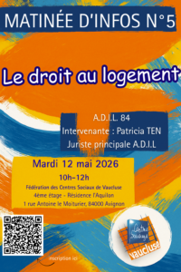 Les matinées d’infos sont des évènements GRATUITS. Elles ont lieu de 10h00 à 12h00 à la FCS84, Résidence L’Aquilon 4ème étage, 1 rue Antoine Le Moiturier 84000 AVIGNON (accueil café/thé à partir de 9h30).